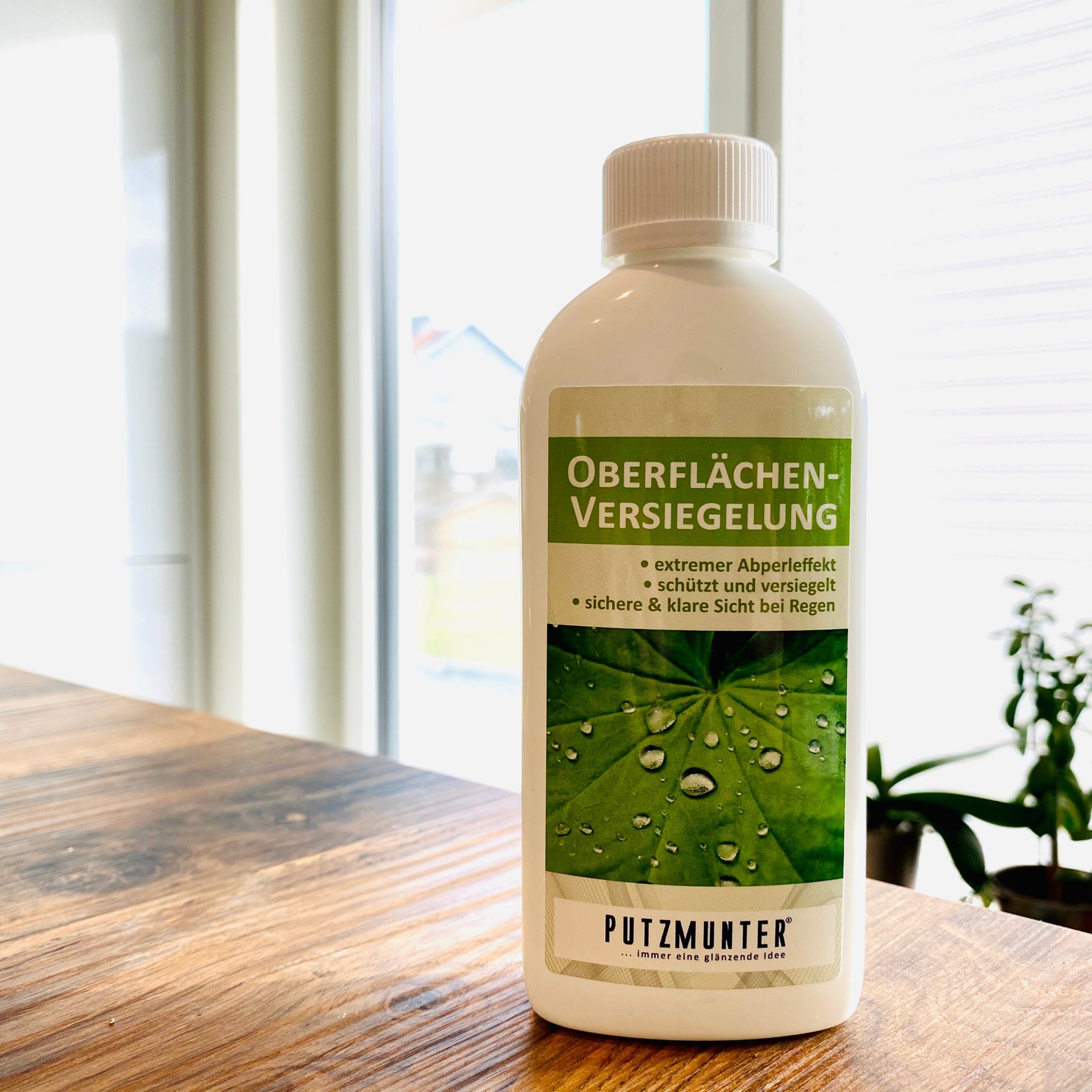 Die PUTZMUNTER Oberflächenversiegelung sorgt für den „unsichtbaren Scheibenwischer-Effekt“ mit extrem hoher Wasserabweiskraft. Ob auf Autoscheiben, Duschkabinen oder Solarzellen – diese Versiegelung schützt und vereinfacht die Reinigung dauerhaft.